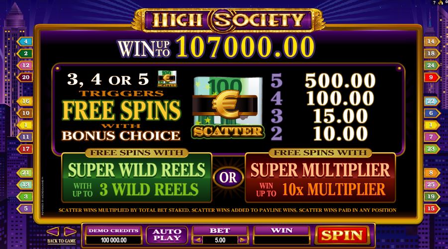 A High Society Logo is used as the wild of the game, a symbol that is only allowed to appear on the 1st and 5th reels. It will take the place of any regular symbol, the scatter being the exception. It’s not a symbol that can give away prizes directly.