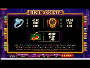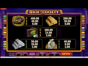 High Society is your not so basic luxury themed slot machine, one of the many to choose such a topic. Though the name is related to high society, the symbols all scream wealth, not class. You have yachts, you have suitcases with money in them, money bags and gold watches, diamond rings and bars of gold, all things that rich people would own. Microgaming created a beautiful looking slot in this case, above average even for luxury themed titles, though there are some great looking ones out there.