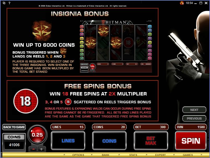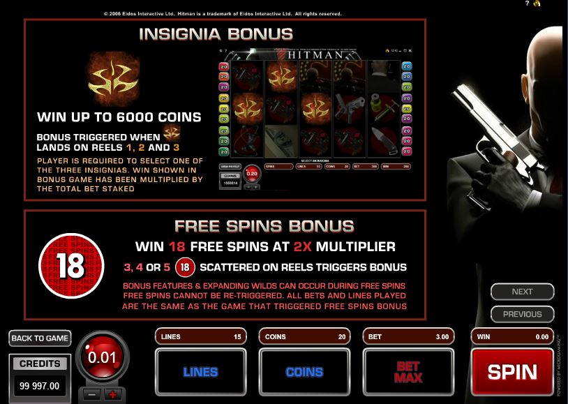One of the two bonus games offered in Hitman, Insignia requires for the Insignia symbols to appear on the first three reels of the game. All three need to be in position, but if that happens a small bonus game starts up.