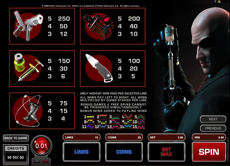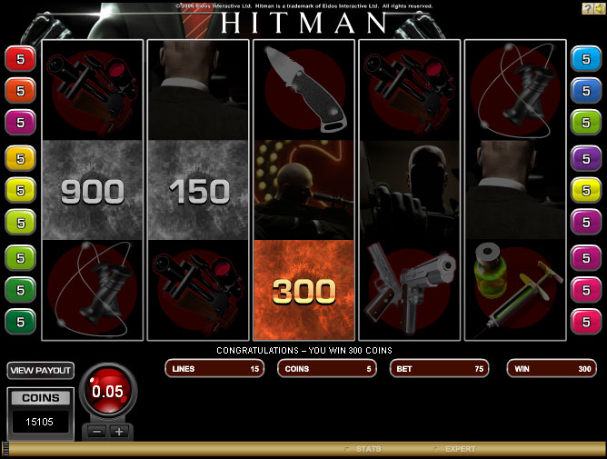 Hitman is a slot machine offered by Microgaming, with the theme being inspired by a video game that any serious player will recognize. Hitman was a very popular video game on the PC when it was launched, and a few other variants were released in the series, besides those very popular initial titles. Now, we have the officially licensed slot machine as well, with plenty of design elements that were borrowed from the game, with the kind of dark and dangerous atmosphere that you would expect from it.