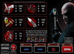The game is influenced by the Hitman video game, so it’s no surprise that the graphics are pretty much identical. The Hitman character appears in multiple symbols, while the rest will give you all kinds of ways to kill someone, from automatic weapons, to small knives or poisonous injections. The design uses a lot of black and dark red, and it’s a decent overall effect.