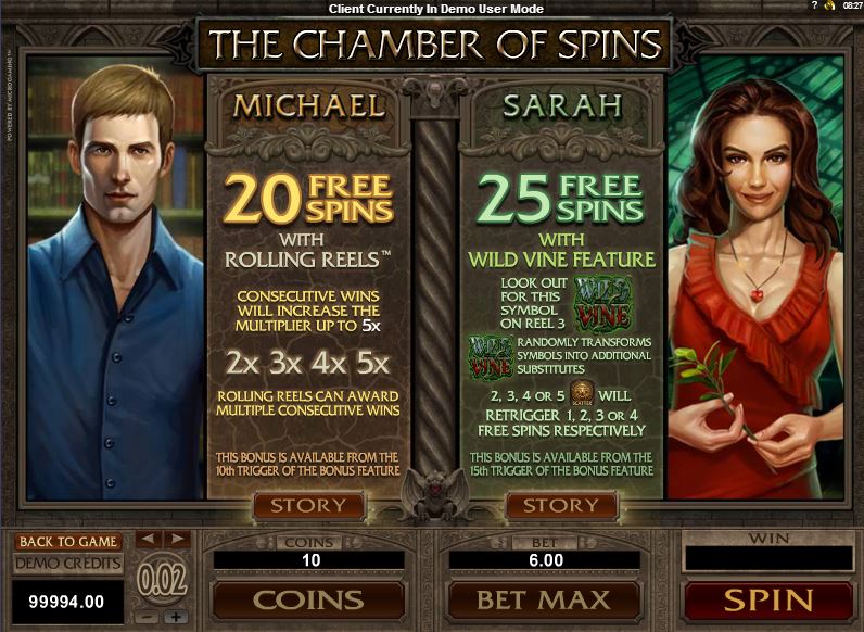 Sarah is the fourth type of bonus feature that you can get from Chamber of Secrets. You need to trigger the bonus game at least 15 times, before you can select Sarah from the list. She will bring you 25 spins for free, with a Wild Vine feature. Whenever the Wild Vine symbol appears on the 3rd reel, it will turn other symbols into wilds, picking them at random. You can also retrigger 1 to 4 free spins, with 2 to 5 scatters.