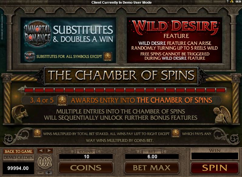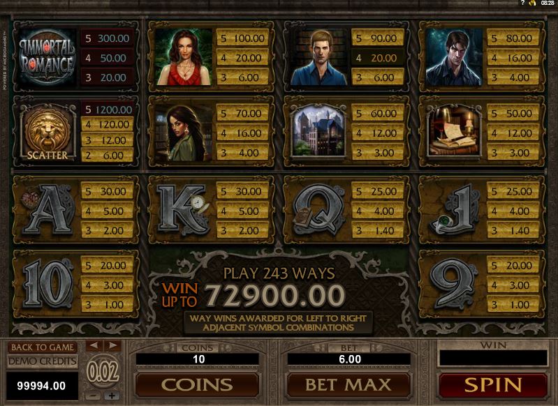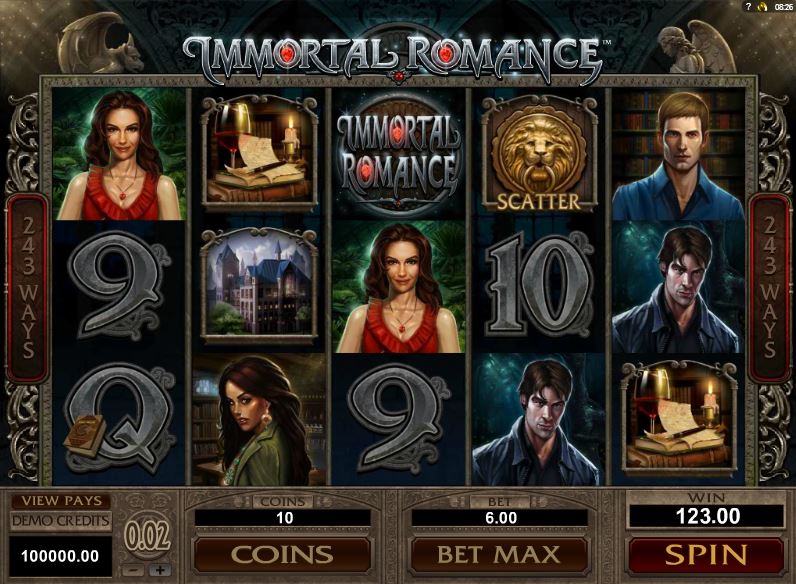As a game that uses ways to win, Immortal Romance will ask only that the symbols which form combinations be on adjacent reels, and going from left to right. They no longer have to be only on a limited number of predetermined paylines, they can be in any position on the reels. That’s how they managed to offer 243 ways to win/paylines.