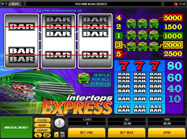 You will find that Intertops Express has 5 lines and that it is a classic 3 reels title. You will also find a wild symbol inside, with prizes giving you up to 5,000 coins ($25,000).