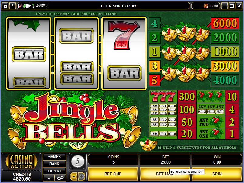 5 paylines are activated in Jingle Bells, if you choose to use the maximum number of coins. This is a 3 reel game, so 5 lines is the most you can expect. There are wild symbols inside, nothing else, but payouts reach $30,000.