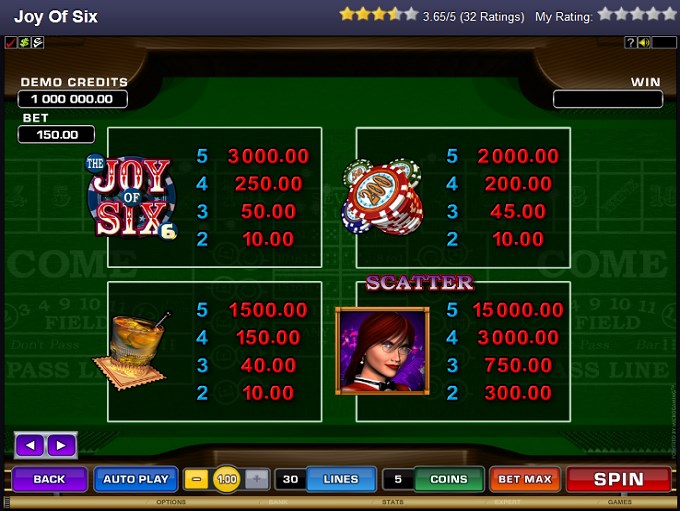 Those that want to place a bet in Joy of Six, can do so with 1 to 5 coins for each active line, and you are free to use only one line if you want to. With up to 30 lines inside, that’s a wager of 150 coins or less. Each coin is valued between $0.01 and $1, which is also a choice left up to the player. The maximum bet per round is $150.