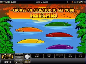 The bonus game allows you to choose from the five colored alligators that are in the water. You can get a maximum of 10 spins for free out of this feature, and the multipliers for all the wins will be at 5x (which explains why there aren’t that many spins for free).