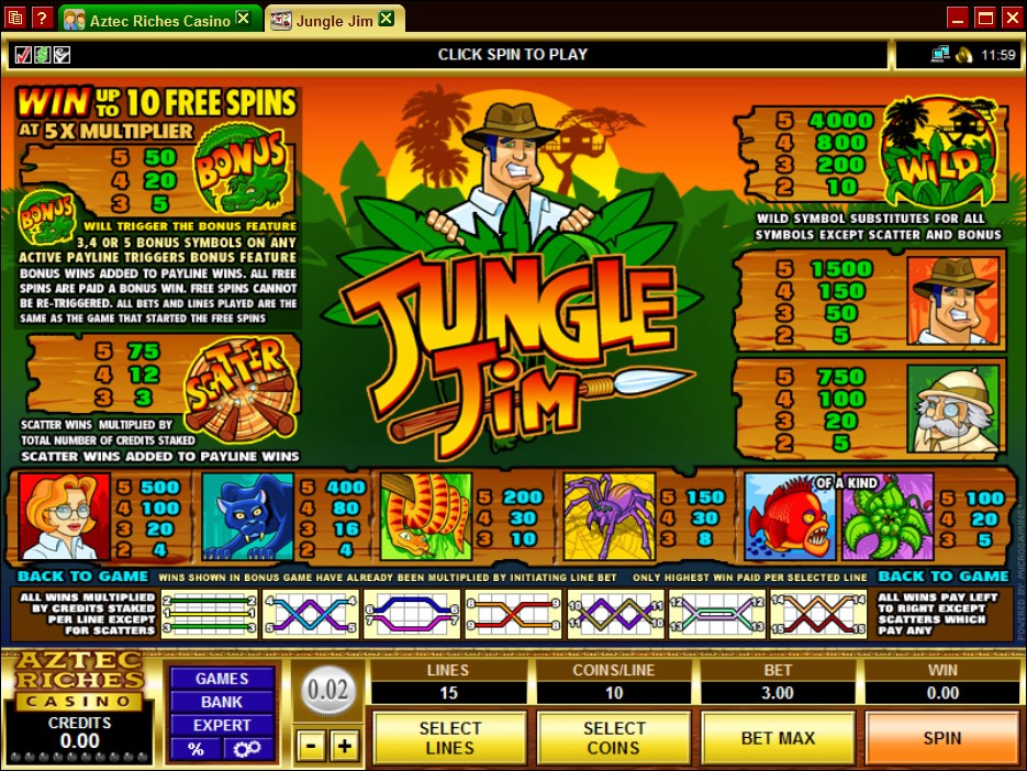 5 reels are placed in Jungle Jim, with a maximum of 15 lines available. You can activate as many as you want, but you should use them all if you want the best shot at the $20,000 jackpot. There are wild symbols in Jungle Jim, scatters, bonus games and free spins with very high multipliers (up to 5x).