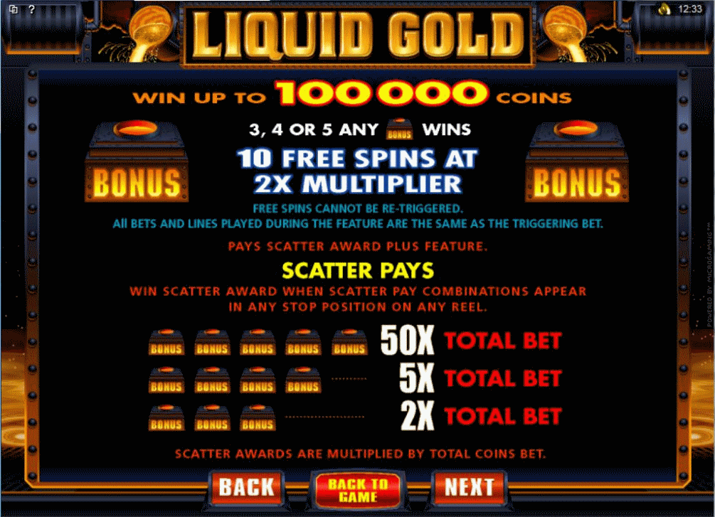 This Liquid Gold slot is offered by all online casinos with Microgaming software, playable either in practice or in real money mode.