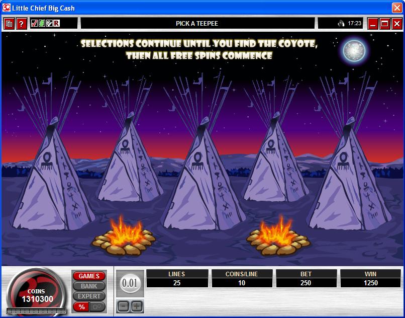 The bonus game starts first though, showing you a view of a Native American village, with five teepees. You pick from the teepees until you get the Coyote, which is when the free spins start. Before you reach the Coyote, hopefully you will get additional free spins or cash prizes from the tents. Even if you find the Coyote from your first try though, you still have those 10 free spins.