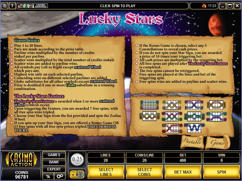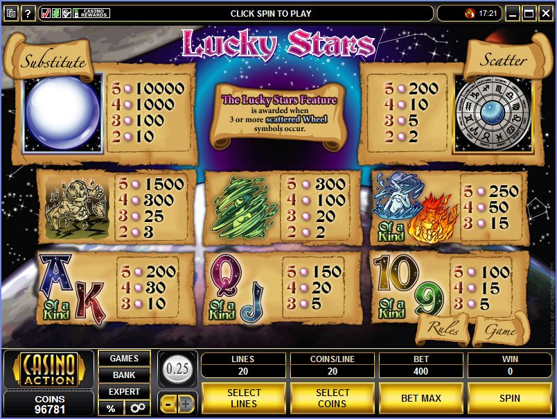 The Lucky Stars slot machine is offered through the Microgaming platform, so if you want to play it for real or just to practice, look out for casinos that use it.