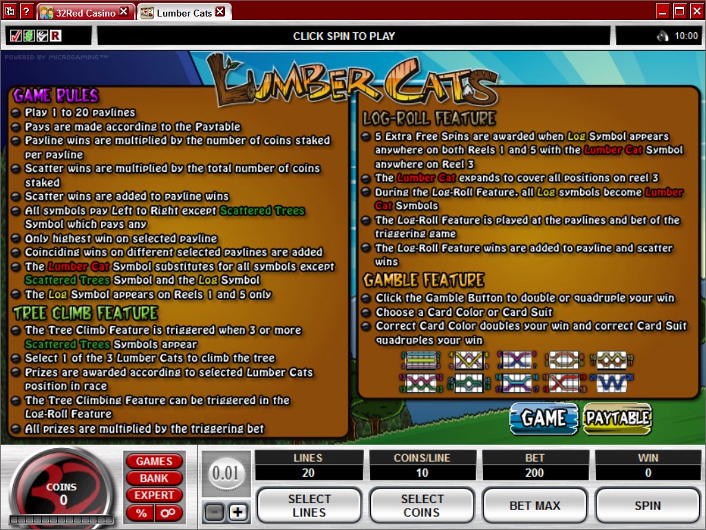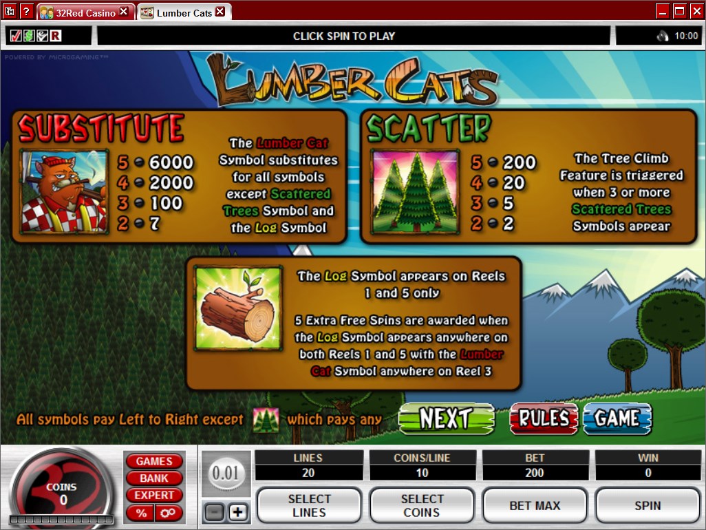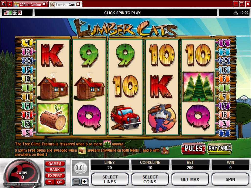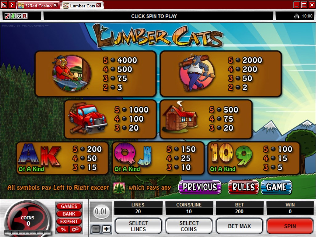 The Lumber Cats slot machine is offered through the Microgaming platform, so if you want to play it for real or just to practice, look out for casinos that use it.
