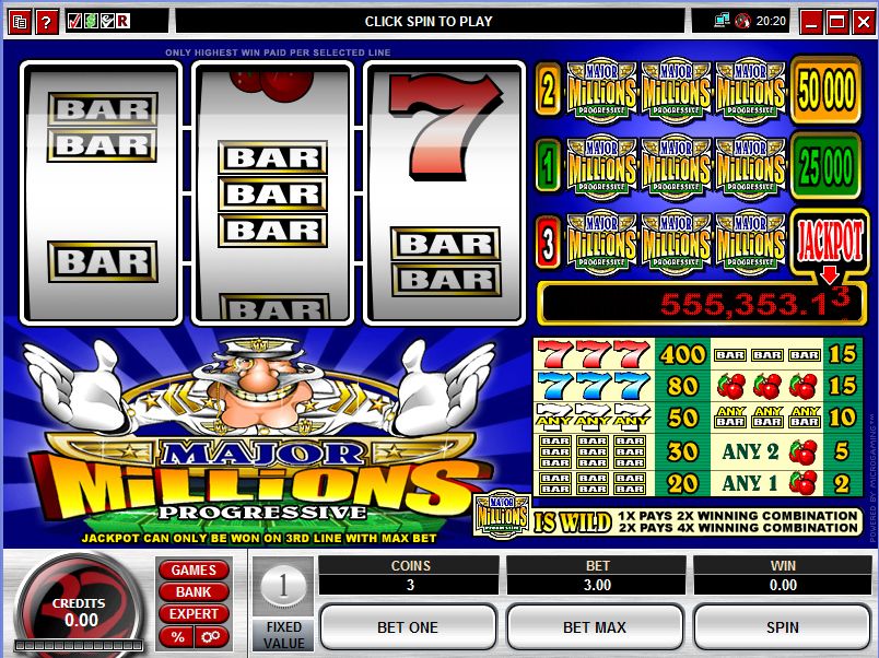 This Major Millions 3-Reel slot is offered by all online casinos with Microgaming software, playable either in practice or in real money mode.