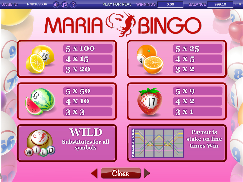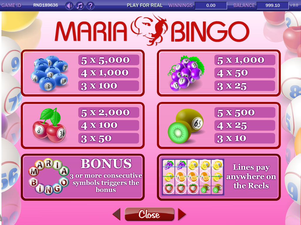 Symbols: Maria Bingo Logo (bonus), Maria Golden Ball (wild), Blueberry Balls (5,000 coins), Cherry Balls (2,000 coins), Grape Balls (1,000 coins), Kiwi Balls (500 coins), Lemon Ball (100 coins), Melon Ball (50 coins), Orange Ball (25 coins) and Strawberry Ball (9 coins).