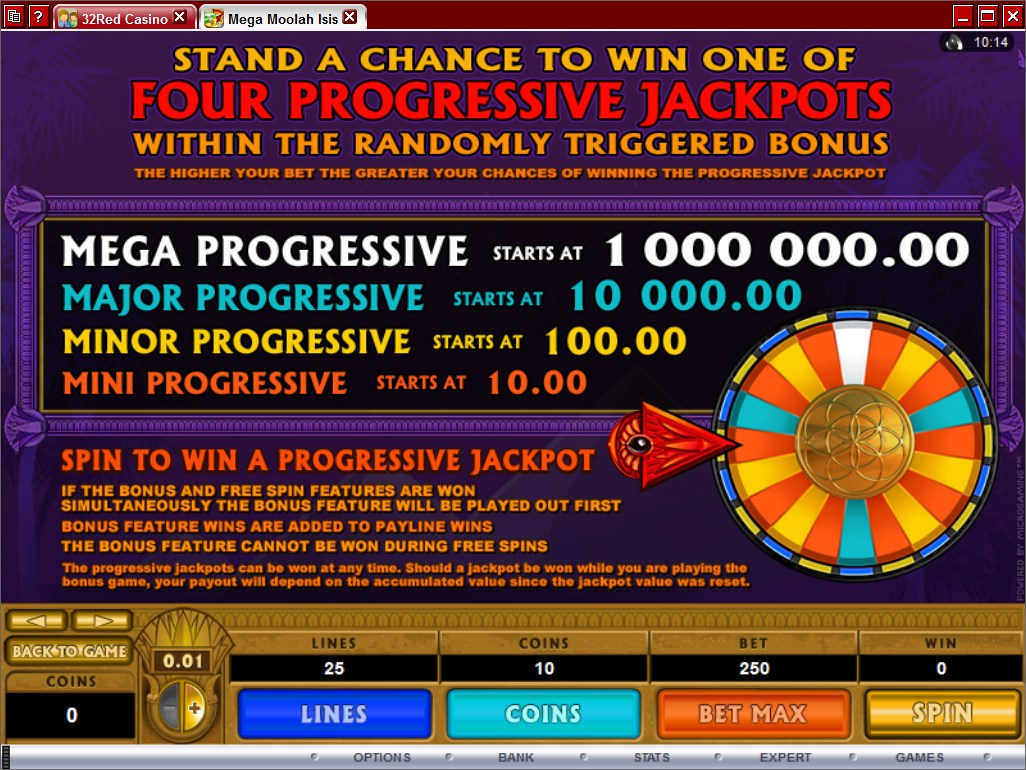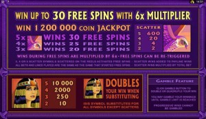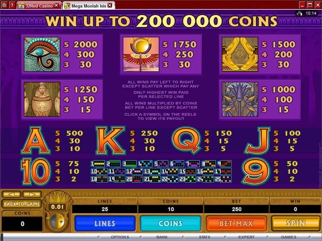 The Isis slot, part of the Mega Moolah series, will put 5 reels and 25 lines in front of you. It has the same progressive jackpot and the feature which triggers it, a $10,000 fixed prize, plus a combination of free spins, 6x multipliers, scatter symbols with big prizes and wilds.