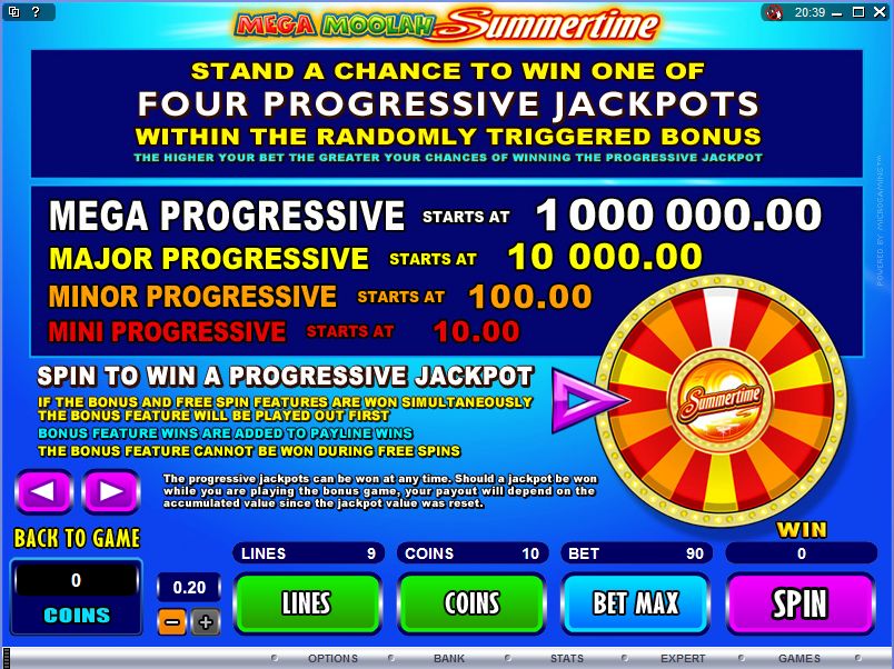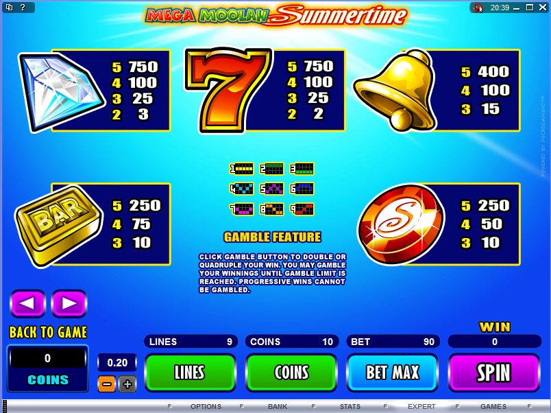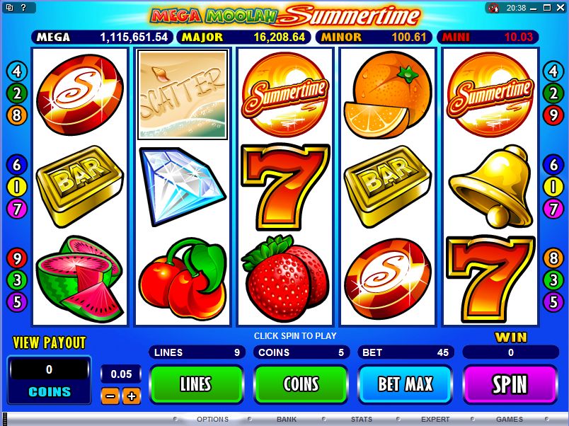The Mega Moolah Summertime slot machine is offered through the Microgaming platform, so if you want to play it for real or just to practice, look out for casinos that use it.
