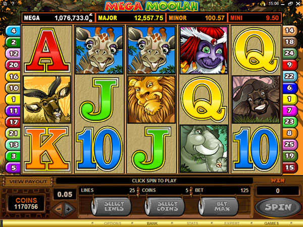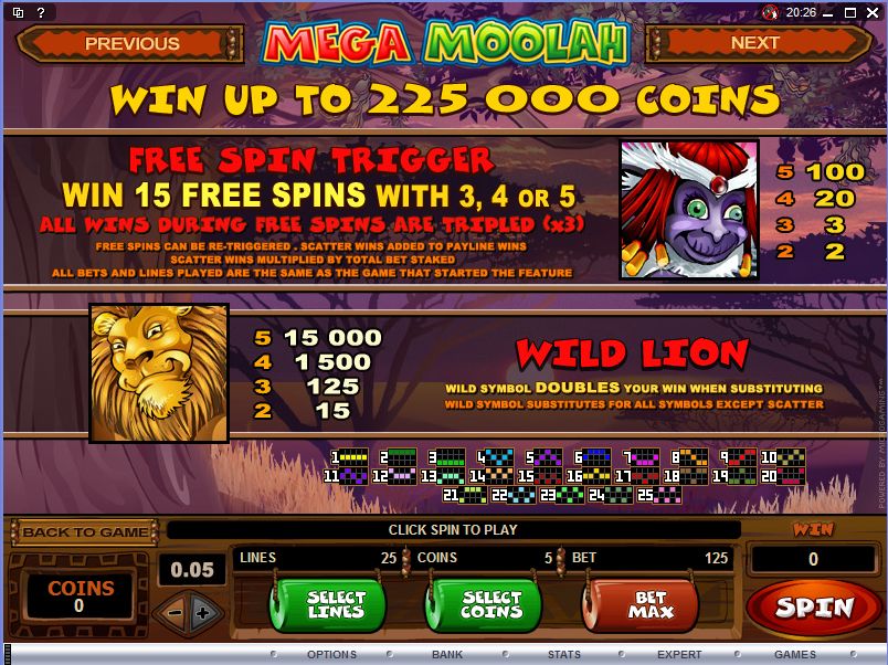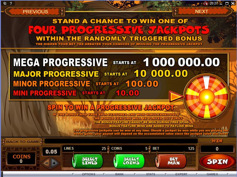 Simply getting this feature doesn’t bring you the huge progressive jackpot though. In it you get a Jackpot Wheel, which spins and stops at one of the 20 spokes. Only one of those 20 spokes brings you the Mega Moolah jackpot, which is worth over $1 million. There are three other progressive jackpots that can be won, which start at values of $10,000 (Major Progressive), $100 (Minor Progressive) and $10 (Mini Progressive).