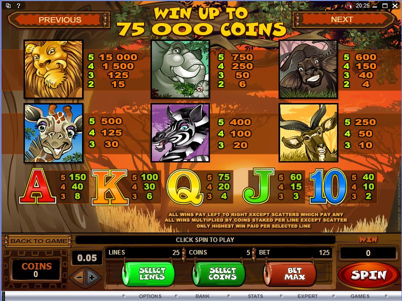 Symbols: Lion (wild, 15,000x), Monkey (100x total wager, scatter), Elephant (750x), Buffalo (600x), Giraffe (500x), Zebra (400x), Kudu (250x), Ace (150x), King (100x), Queen (75x), Jack (60x) and 10 (40x).