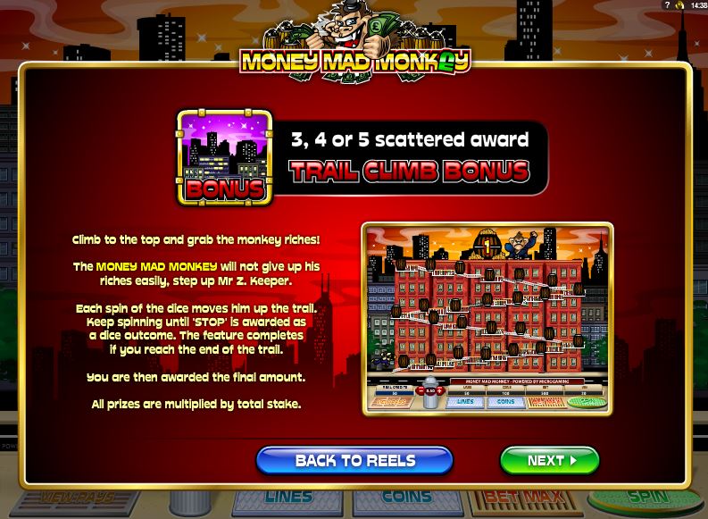 The other bonus game of Money Mad Monkey is called Trail Climb. It’s triggered by the third scatter symbol, the one with the city skyline at night. 3 or more of these scatters will be sufficient to start up the bonus game.