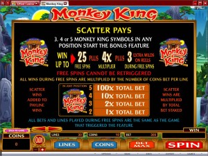 You get a maximum of 30 bet lines in Monkey King, a 5 reel slot machine. There are free spins to take advantage of, with multipliers enhancing their prizes, plus you will encounter scatter symbols and wilds along the way as well. The biggest prizes mentioned by the paytable are on the low side, worth up to $1,000.