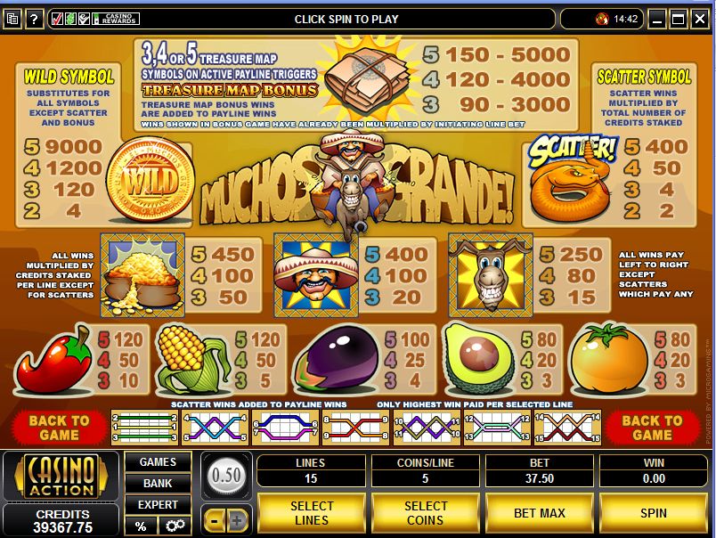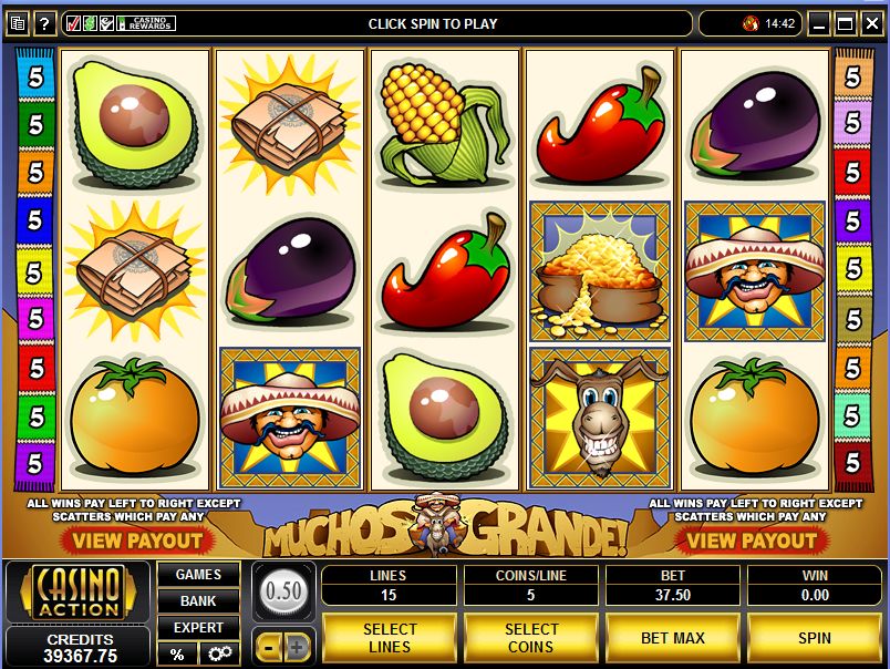 5 reels are used in Muchos Grande, with up to 15 active lines selected on them. The features include a bonus game, a scatter symbol and a wild. Top payouts of up to $22,500 are advertised on the game’s paytable.