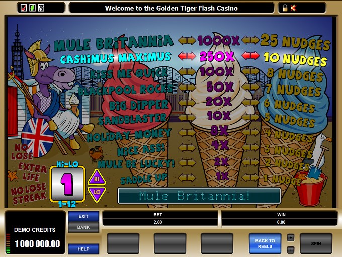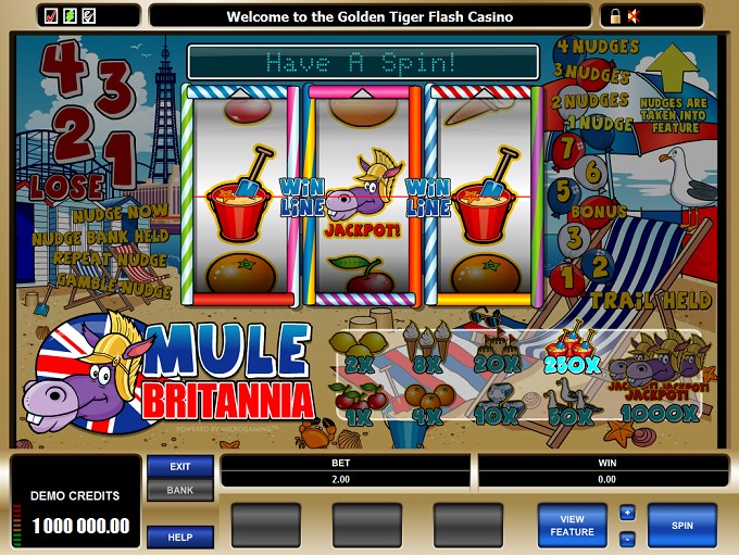 You will find Mule Britannia at any online casino which chooses to use software from Microgaming, playable either for free or for real money.