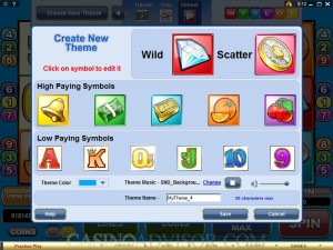 In order to start changing the design of the slot, you go to the Theme Menu and you access the Create New Theme section. You are taken to a page with all the symbols displayed, and you have the option to click on each one in order to edit it. You have six low paying symbols in the form of playing cards, plus five high paying symbols and two feature symbols. You need 13 images total to replace all the symbols with your own. Other options on that page include the theme color and the ability to change the music.