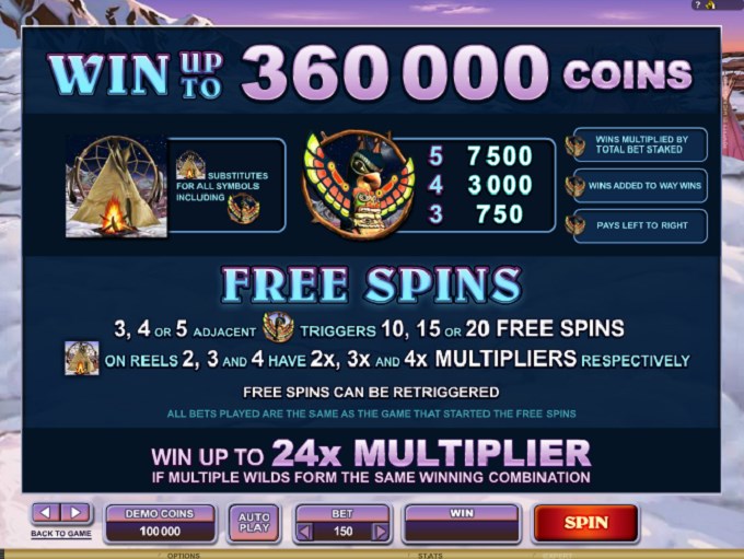 The Eagle Totem is the scatter symbol in this case, a symbol capable of awarding free spins and triggering cash prizes that reach a value of 50x the total bet value. You need up to five randomly placed symbols in order to get that kind of prize, plus you also get the free spins. In both cases, you need 3+ scattered symbols.