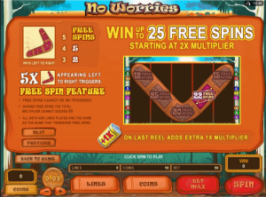 You will find 9 paylines on the 5 reels of No Worries. The game is filled with interesting features, with the free spins and their multipliers of up to 8x being my favorites, but with scatter symbols and wilds being close behind. The slot’s top payout is at $12,500.