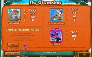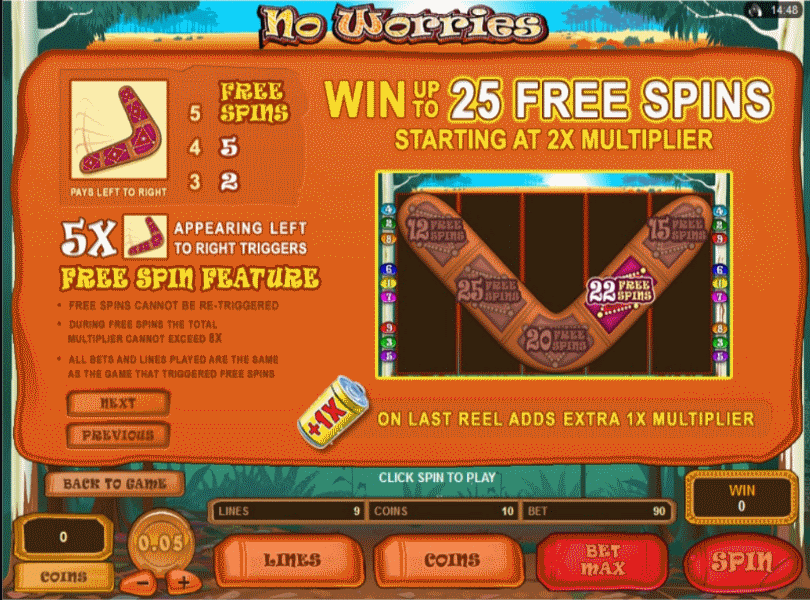 The third feature symbol of No Worries shows you the Boomerang. It’s a symbol which needs to appear from left to right, on a payline, in order to trigger its feature. You get a small prize when you have three or four symbols arranged this way, while five symbols will offer you the free spins feature.