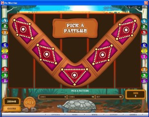 The symbols disappear from the reels on the next screen, and a boomerang appears in front of them, with five sections on it, each one with a different pattern. You click on one of the five patterns, and you find out the number of free spins that you’ve won.
