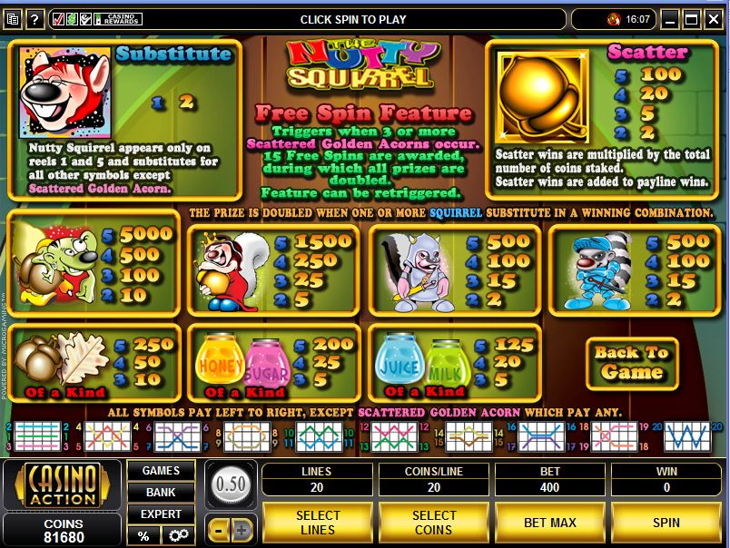 The Nutty Squirrel slot machine is offered through the Microgaming platform, so if you want to play it for real or just to practice, look out for casinos that use it.