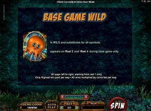 If a Fish wild lands on the 3rd reel, all the Baby Octopus wilds which are present and part of a winning combo will ink themselves. Those combos, with inked wilds in them, will now pay double the initial amount. The same 2x multiplier is also brought by the Fish wild, when it’s part of a combo of regular symbols.