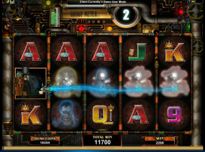 The two wild symbols, Thurmingham and Carstairs, will capture the ghost symbols which appear on the same row as they do, and they do it with the help of a zap weapon, with a nice little animation. For each captured ghost, you get a prize worth twice the value of the round’s bet. If you have both wilds on the same row, any ghosts captured between them will offer you 4x the bet instead of 2x.