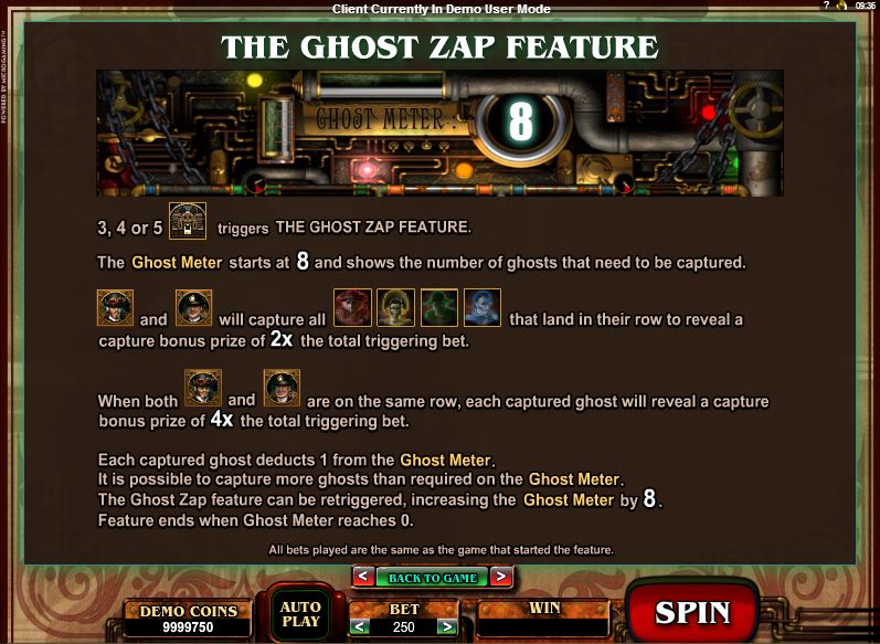 Having 3 to 5 scattered Mansions on the reels of this game will trigger the Ghost Zap feature for you. You will notice a Ghost Meter at the top of the game area, which starts at 8 and it goes down with each ghost that you manage to capture along the way.