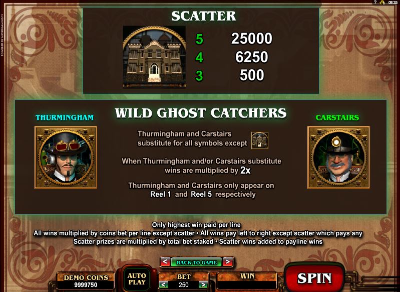 Two different Ghost Catcher wilds are present in the game. The two characters which are used as their images are called Thurmingham and Carstairs. These symbols are capable of substituting for any other regular ones, so the Mansion scatter is excluded. You will find Thurmingham on the 1st reel when it makes an appearance, while Carstairs is only present on the 5th reel. Both wilds contribute to their wins with 2x multipliers, doubling their value.