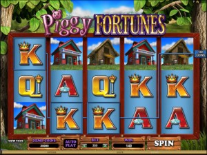 The design in Piggy Fortunes is 3D and it looks like it was computer made. The symbols are a mix of houses and the main characters, with the very ugly playing cards also present. An image with green meadows and trees is placed behind the game area. It’s a good looking slot machine, one which I wouldn’t mind playing again, but it could’ve been so much better without those pesky cards present.