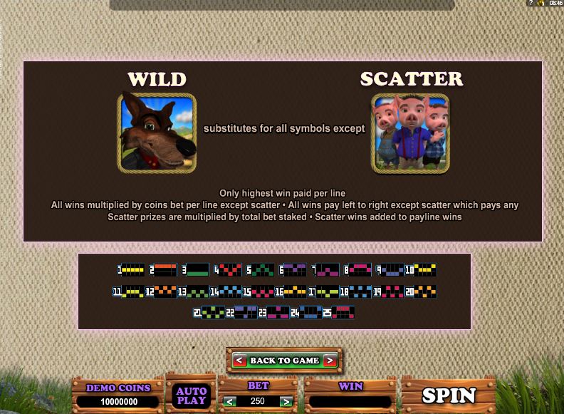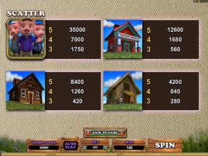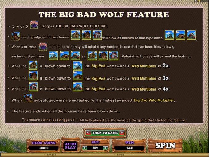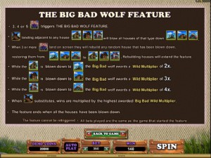 The bonus game is based on the story which inspired this slot machine. The appearance of the Wolf symbol next to one of the three types of houses will result in them being blown down. The wolf, acting as a wild, will also apply a multiplier of 2x to 4x at that point.