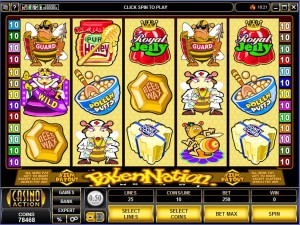 The game’s design, though very bee themed, is a bit too much towards caricature when the characters are concerned. They’re made to look more like characters and humanized in order to fit that role, but some of their characteristics have been exaggerated in the process and the effect is not a pleasant one. Still, it does look like a bee and honey themed slot machine, so at least Microgaming accomplished that much. You also get only symbols that have a theme connection, they didn’t include playing cards in this case, and that’s always a plus.