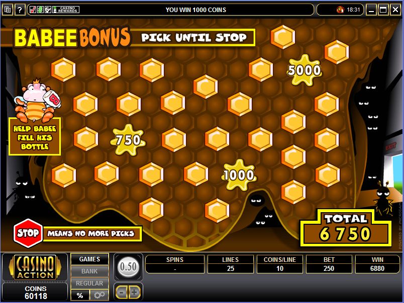 You are taken to a new screen when that happens, where you are shown a honeycomb structure. You have to pick honey filled spots, and each one will reveal another prize. The game continues until you find one of the Stop signs, at which point you collect your winnings and you return to the base game.