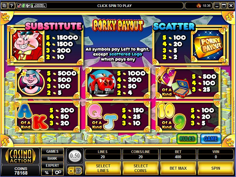 As many as 20 paylines are present in Porky Payout, your typical 5 reel game basically. Its prizes are as impressive as you would hope since it’s luxury themed, offering up to $150,000. As for the regular features, they include a bonus game, a wild and a scatter.