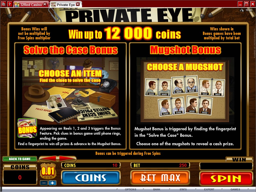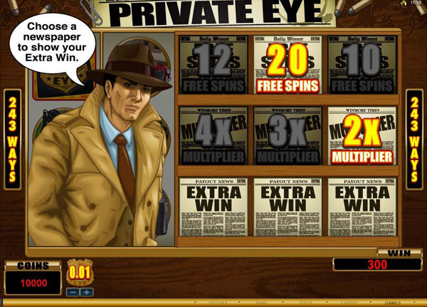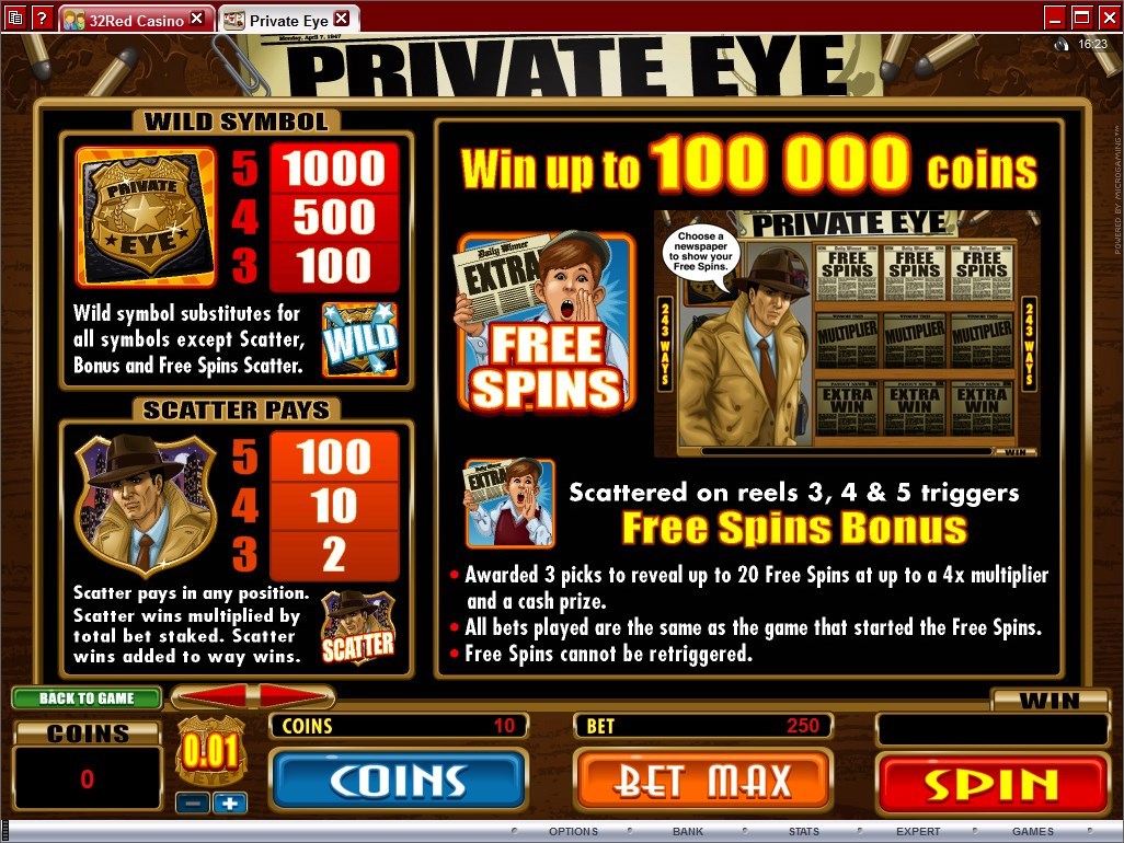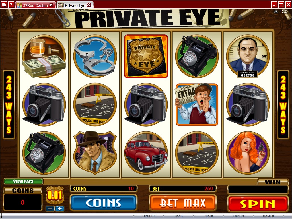 There are a lot of so called paylines in Private Eye, as it uses the ways to win system, with 243 being available. Top payouts of $2,500 and free spins, wilds, multipliers and scatters are all part of the game.