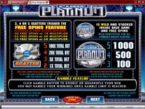 Microgaming crammed 40 bet lines on the 5 reels of Pure Platinum. With so many chances to get a prize, the top payouts are less than impressive, offering up to $500. Among its features you will find the free spins, the multipliers, scatter symbols and a stacked wild.