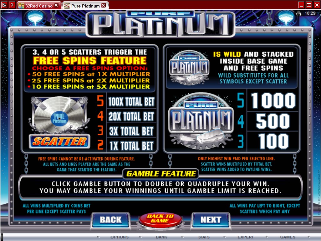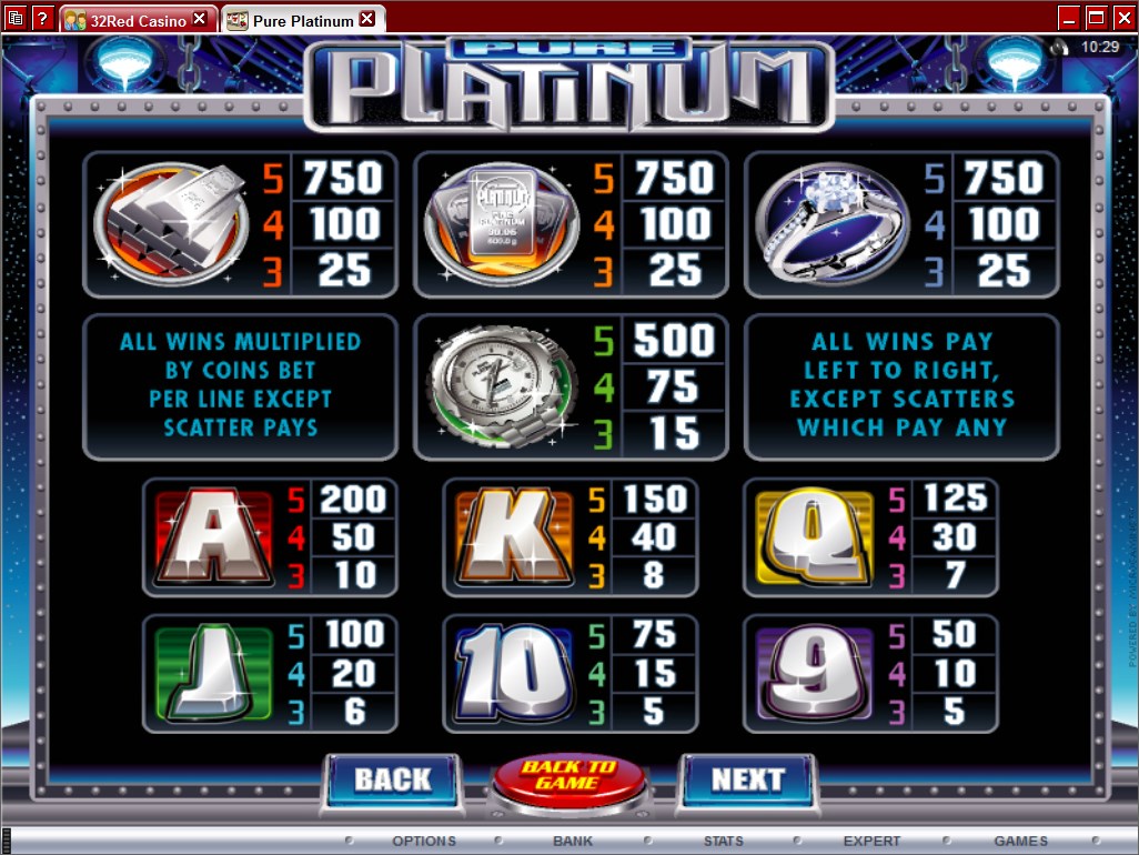 This Pure Platinum slot is offered by all online casinos with Microgaming software, playable either in practice or in real money mode.