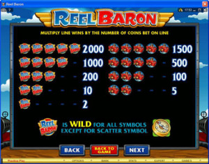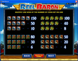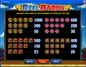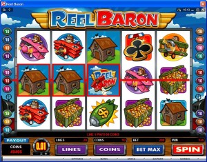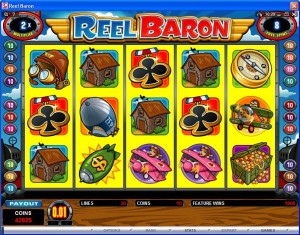 Reel Baron seems to be a slot machine with a theme inspired by the Red Baron, a famous World War I airplane pilot, whose simple appearance made enemies fear for their lives. He was one of the aces of World War I, and a pilot in the German Air Force of the time. The game is a bit more humorous and funny looking than the reality, using pink airplanes with hearts on them, zeppelins with dollar signs painted on and even ammo boxes filled with treasures.