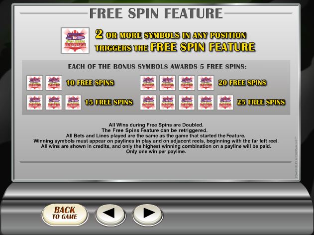 The number of scatter symbols present on the screen doesn’t just give you the amount you win, but also triggers a certain quantity of free spins. The minimum of two scatters will only bring you 10 spins for free, but you get an additional 5 free spins for each extra scatter. The most you can get is 25 free spins, when five scattered symbols are present.