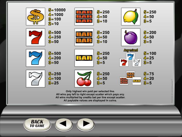 The game pretty much looks like you would imagine a classic slot would, if it got a modern layout. It’s made out of brushed metal or aluminum, with a silvery look to it. It has classic symbols only, with fruit, bar icons, sevens and dollar signs, plus some very impressive features that most modern games don’t have.