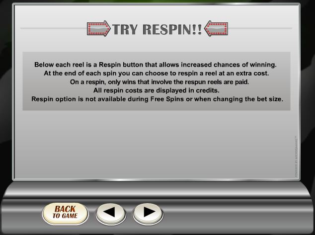If you look at the reels, you will notice that each one has a Respin button underneath, plus a number. If you agree to pay the amount displayed there, the game will respin the reel that you choose, giving you an extra chance to form a paying combo, or to improve an existing one.