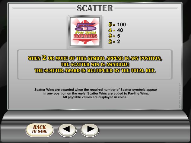 The game has a single scatter symbol, and it is the one that both triggers the round with free spins and some cash prizes. The payouts vary between 2x and 100x the triggering wager, and they’re offered for two to five bonus symbols scattered on the reels. The Logo on it reads “5 Free Spins Bonus”.