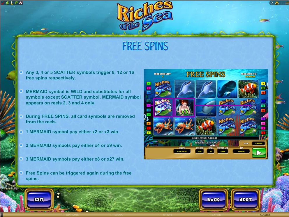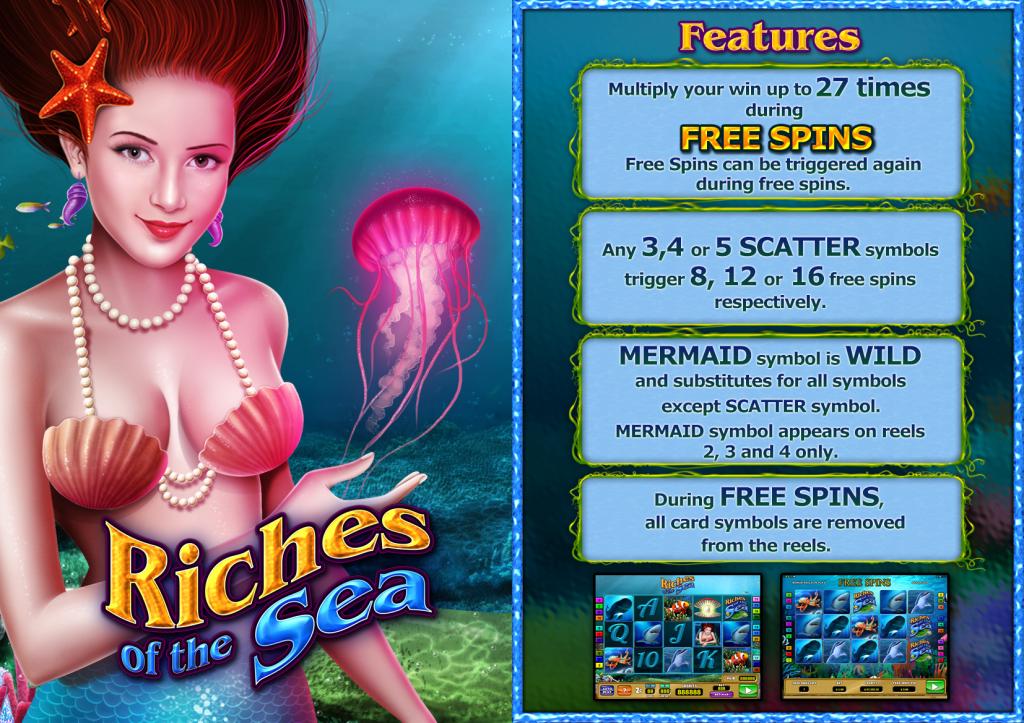 Riches of the Sea gets 5 reels as usual, and the paylines are 20 in total. It has free games, multipliers as high as 27x, wild symbols and a scatter. The regular prizes will go up to $1,875.